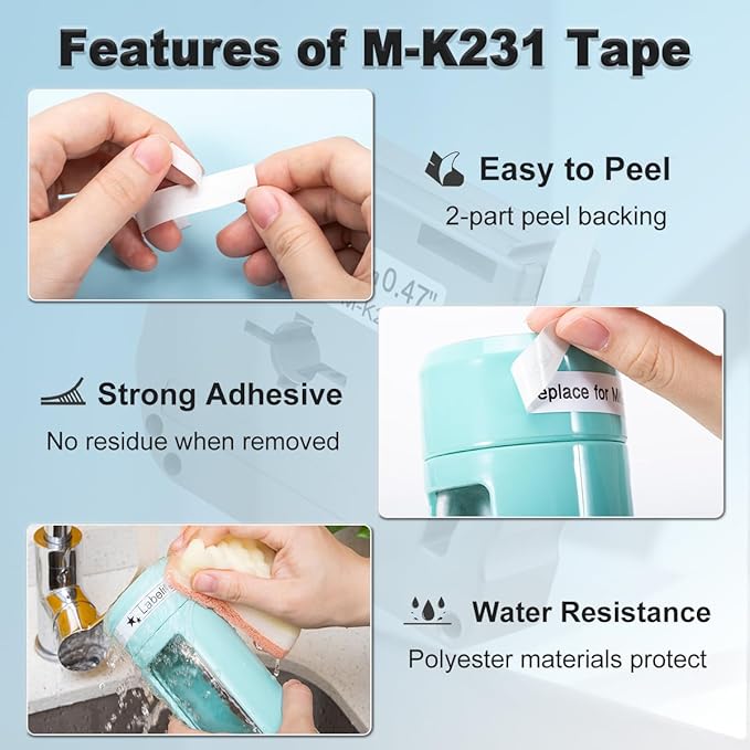 - Features: The backing of M M231 MK231 tape is purposely designed as 2 parts and has a slit in the middle to make it easy to peel from the Middle than from the Side. Matte design makes reading easier. Bold printing will be clearer. Its Polypropylene material makes it much more durable and water resistant than similar Mk231 Direct Thermal Non-laminated Tape. Strong Adhesive and No sticky Residue Remains When Removed