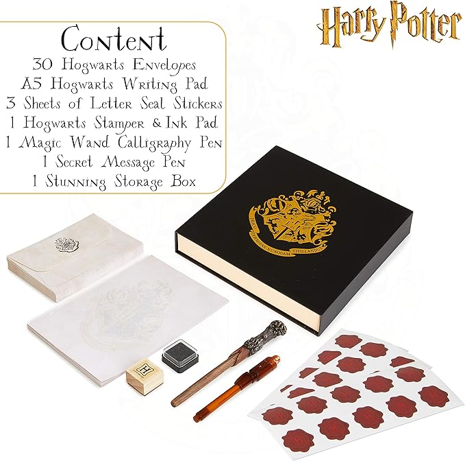 - Bring the Wizarding World to Life – Complete letter writing kit with a Hogwarts themed A5 notebook, envelopes, papers, stickers, pens, stamp with ink pad, ideal for crafting spells or personal notes.