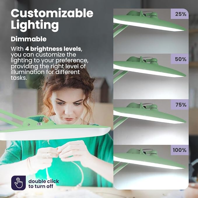 - Versatile & User-Friendly – This office desk lamp allows you to adapt the lighting to your needs with four brightness levels (100%, 75%, 50%, or 25%). The flexible clamp design ensures optimal lighting angles, making it perfect as a desktop lamp or workbench light to enhance productivity and comfort during various activities.