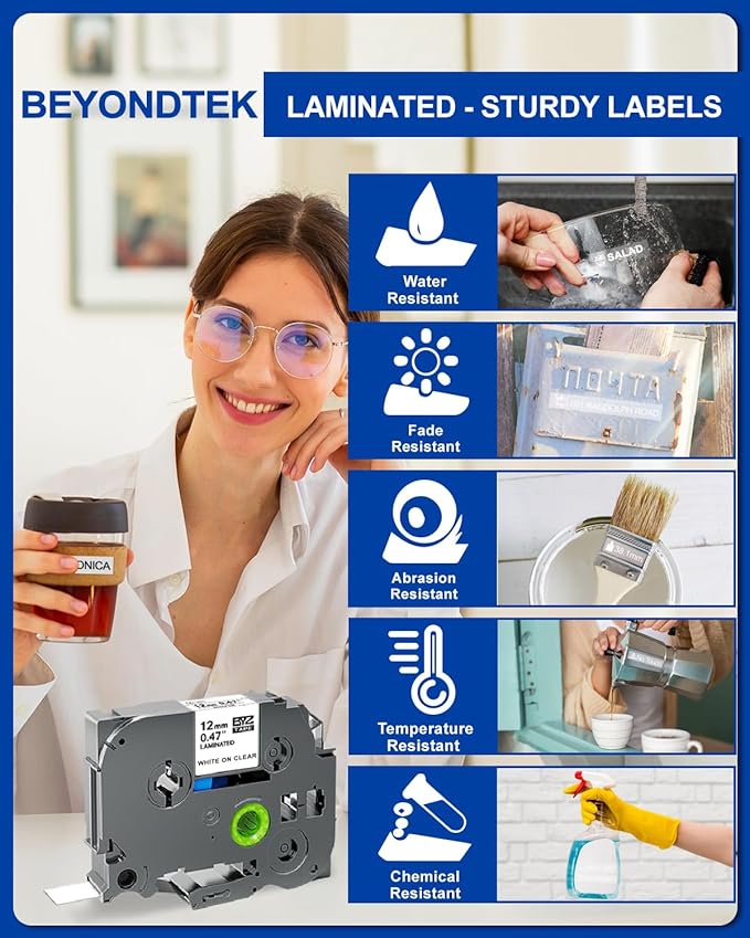 - Application:Ptouch Label Tape Clear 12mm 0.47 Inch Laminated are perfect for indoor and outdoor use, like home, factory, office, school, lab and lots of places. And even can be used in freezers, microwaves, and they won't peel off, smudge or fade.