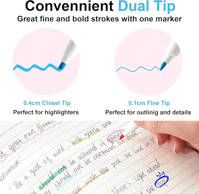 - DOUBLE ENDED DESIGN: Shuttle Art dual tip pastel highlighters with broad and fine twin tips for both highlighting and underlining. The versatile chisel tip measures about 0.4cm, which allows you to switch seamlessly between broad and fine widths for a smooth, organized workflow. The wedge of fine tip enables to deliver 0.1cm lines for precision creation.