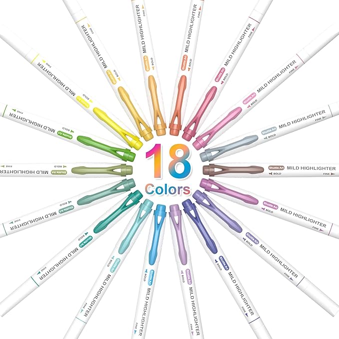 - TRENDY SOFT COLOURS FOR MULTIPURPOSE: Shuttle Art 18 colours highlighter pens set featured incredibly fun and trendy shades of soft pastel ink. The markers set gives you an appealing set of options to doodle, decorate and emphasize your textbooks, faxes, journals, notes and assorted planners in a subtle but stylish look.