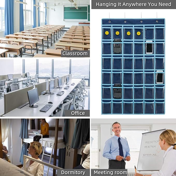 - đăCan be used as a multi-function hanging pocket organizerăThis 36 classroom pocket storage doesnât just hold calculator and cell phones, it can also hold earbuds,stationery,office products, attendance cards, business cards,keys, socks, jewelry and any small things you want to storage. It's also useful for meeting room,office, university, dormitory and home.