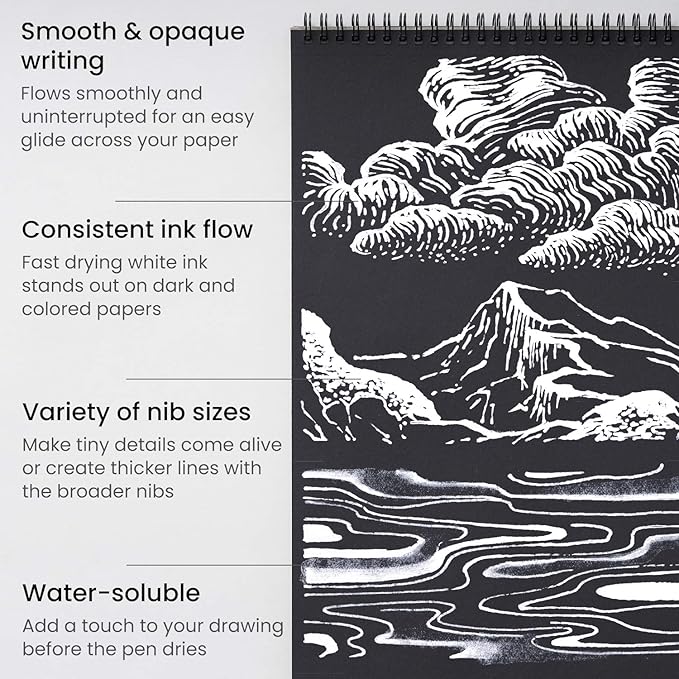 - Works on Any Colored Surface: The opaque white ink in the white detail pen dries quickly and remains white on all colored surfaces including black surfaces.