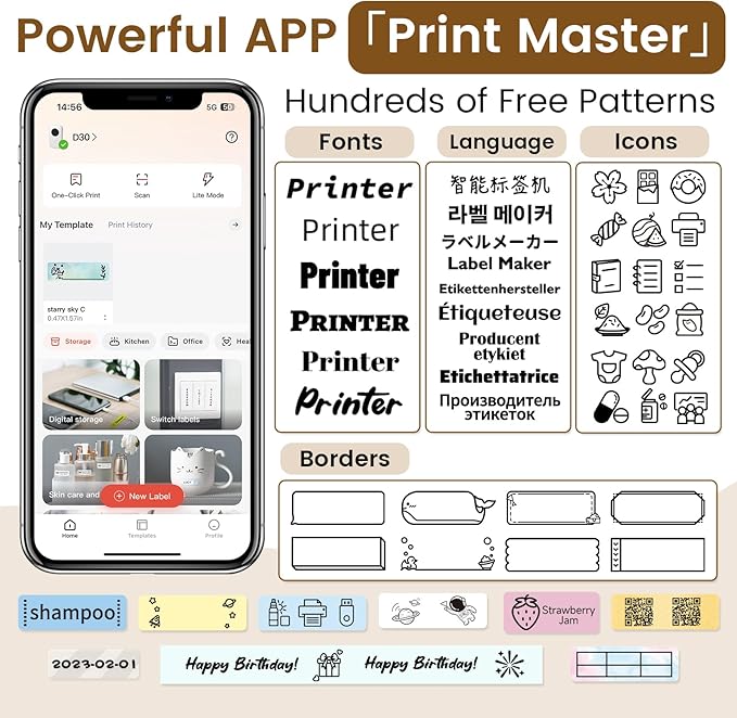 - Save Money - Direct thermal technology - The D30 Bluetooth label makers are inkless printing and don't require ink, toner, or ribbons. With lots of thermal colorful label tapes of your choice, the cost is tangible and much lower compared to most label-maker printers.(This label maker is Monochrome Printing Output, which only prints black text. We can create color-label artwork, printing with color-patterned label tapes is required. )