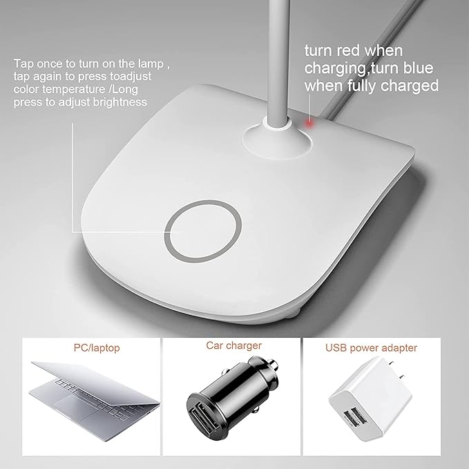 - Long Lasting Touch Lamp: this LED lamp is equipped with 1800 MAH built-in rechargeable battery, will work 4-6 hours at highest brightness after full charged. The included 4.9ft USB cable is very handy to charge the lamp with USB adapter(not included) power bank, USB wall outlet, laptop or desktop(Please charge the lamp to protect the battery's lifespan if long time no use)