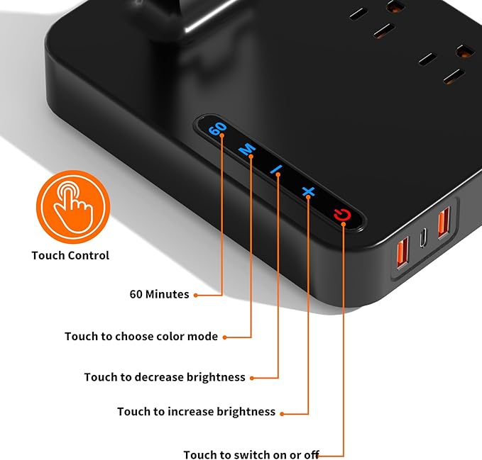 - 【Multiple Functions】Equipped 3 Port USB Chargers(5V/4.5A),2 Outlet Power Socket(1250W),memory function, 3 lighting modes, 3 brightness Levels, 60-minute timer, office lamp, night light, task work lamp, dorm arm lamp,reading lamp,computer lamp.College dorm room essentials for students.