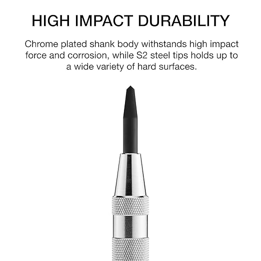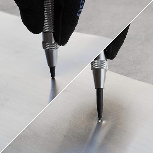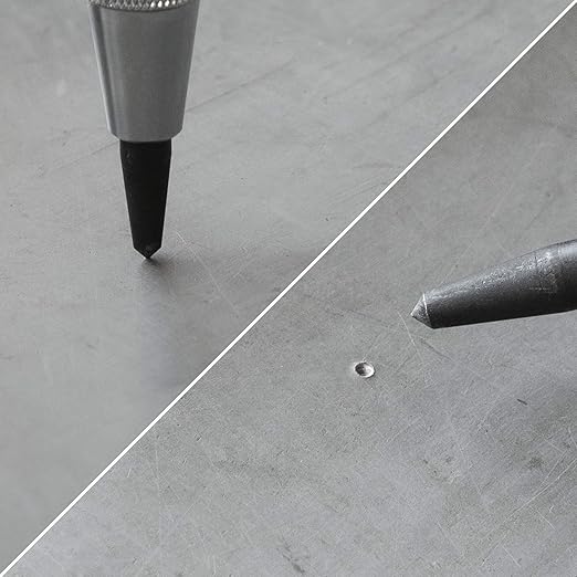 - EASY ONE-HANDED USE: This one-handed automatic center punch needs only your hands—no hammer required. Use the S2 tip on a sturdy surface to center where you want the starter hole, and punch the tool downward to create the drill marker.