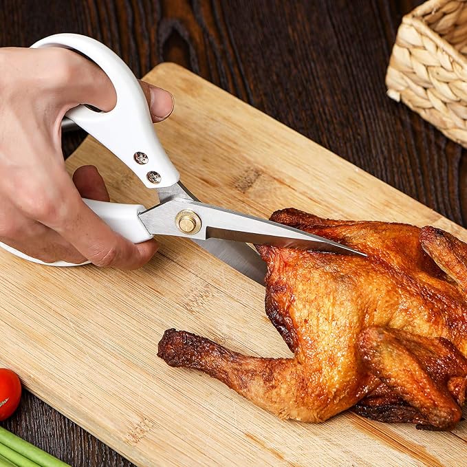 - THE SHARPEST KITCHEN SHEARS: Adapt to a large number of kitchen work, cut meat, turkey, cut poultry bone, You can also use it to scrape scale fish, cut all kinds of vegetables, fruit, cut noodles and even pizza. Do not need chopping boards and choppers, bring kitchen work more convenience.