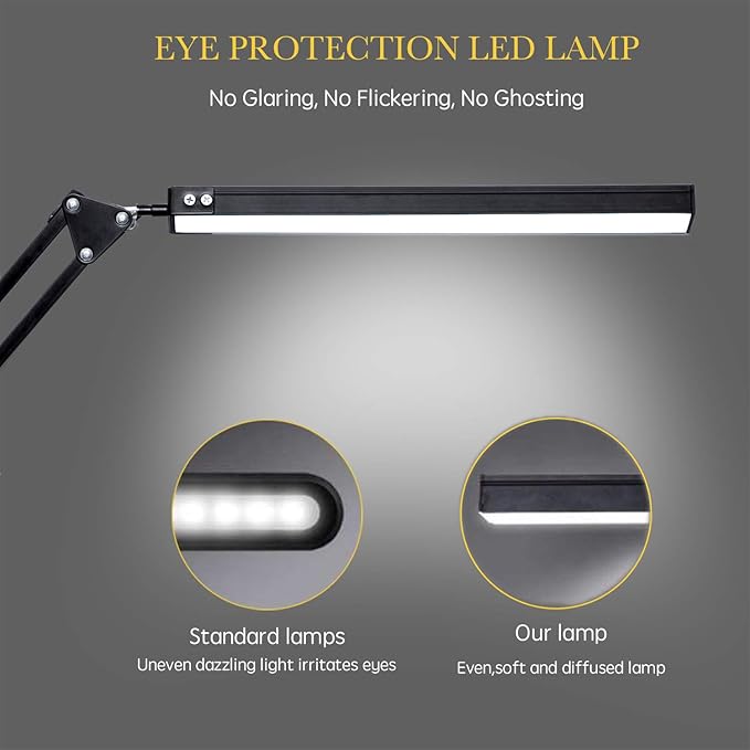 LED Desk Lamp, Adjustable Swing Arm Lamp with Clamp, Eye-Caring Reading Light, 10 Brightness Levels, 3 Lighting Modes, Memory Function Lamps for Home Office Adapter (Black)