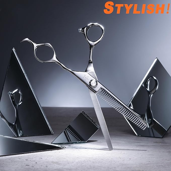 - ⭐Features: Adopt high solid bearing screw to connect the scissors blade, just manually rotate the screw to adjust the tightness of the scissors to meet your need for a sense of shear. In addition, precise screws can balance the overall weight of the scissors.