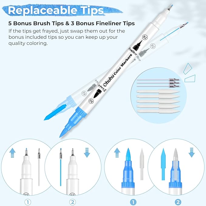 - INCLUDES 8 REPLACEMENT TIPS: Each package comes with 5 replacement brush nibs, 3 fine tips, and a pre-printed numbered color swatch card for your convenience. Ohuhu colored markers set make a perfect gift for birthdays, Christmas, Valentine’s Day, back to school, or any occasion!