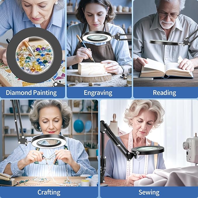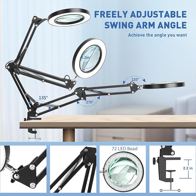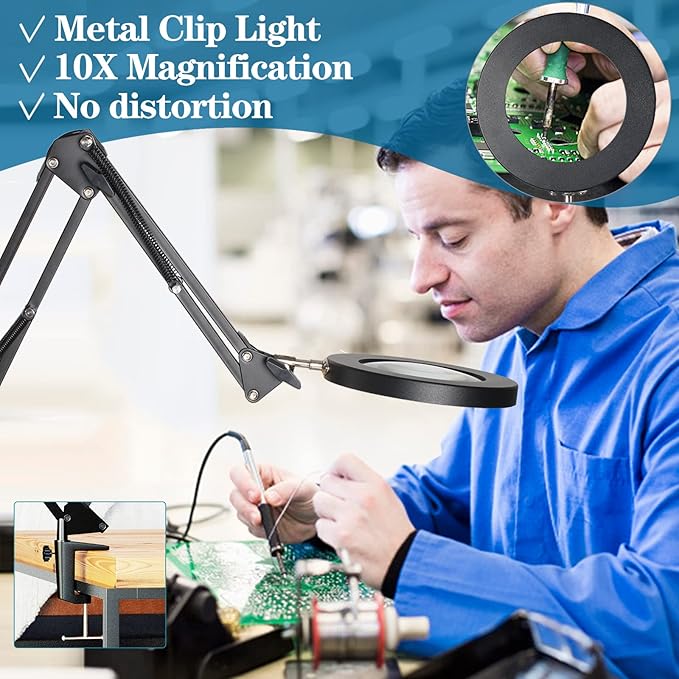 - 【Eye-Friendly & Strong Metal Clamp】The LED lights used in our magnifying light are designed to be gentle on your eyes, even if you look for a long time, you won't feel tired. the strong metal clamp to the edge of a flat surface (<2.1"" thick) as clip on light, Which your desktop, table, or workbench securely, ensuring that the magnifying glass with light and stand stays in place