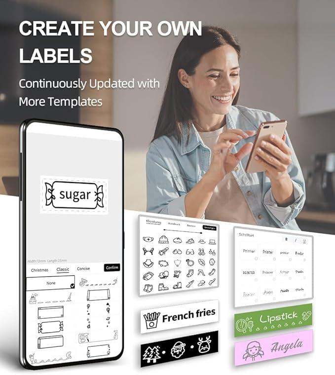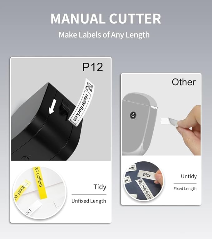 - Bluetooth Connectivity for Fast Printing: Phomemo label printer compatible with IOS & Android Phones, connects your mobile phone easily,you can download the "Print Master" app, from Google Play or App Store. The app provides 11+ languages, 25+ fonts, 12+ frames, 1000+ symbols, and more to print a variety of time, text, numbers, graphics, symbols, logos, barcodes, QR codes, border, and create personalized labels with ease. P12 label maker with built-in cutter for easy label cutting, supports printing of 1-3 lines of text and small spacing of labels to avoid label waste. The label templates you create can be saved in the application for next time printing