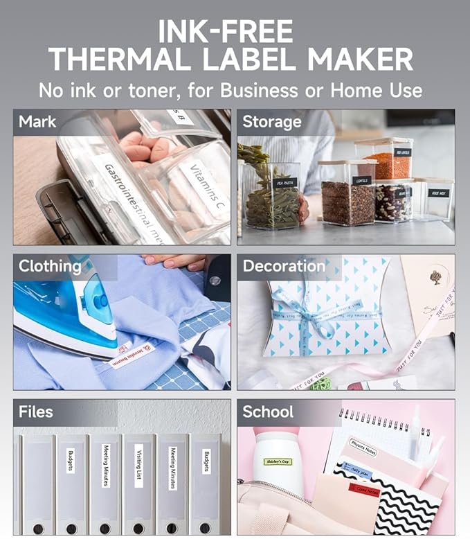 - Ideal for Home, Office and Small Business: Bluetooth label maker utilizes thermal and thermal transfer technology to enjoy high-definition printing without ink or toner. Mini label printer are BPA-free can make brightly colored paper labels, labels are waterproof, oil proof, scratch proof and tear proof, in addition to support printing on ribbon labels, customize different gift packages for your friends with different holiday designs for more uniqueness. Ideal for kitchen, party, pantry, garden, garage, tools, home and office organization. (Tip: When replacing new labels, please pull out the paper about 5 mm to avoid paper jam)