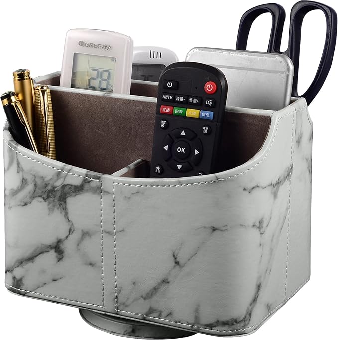 - SUITABLE DESIGN: our remote control storage comes with an easy-to-spin 360° rotating base, providing you easy access to put or take items, whether you place it on the couch, armchair,table, or anywhere around your house , The 5 compartment desk organizer can be used to store remote controls, office supplies, media accessories, small electronic devices and more.