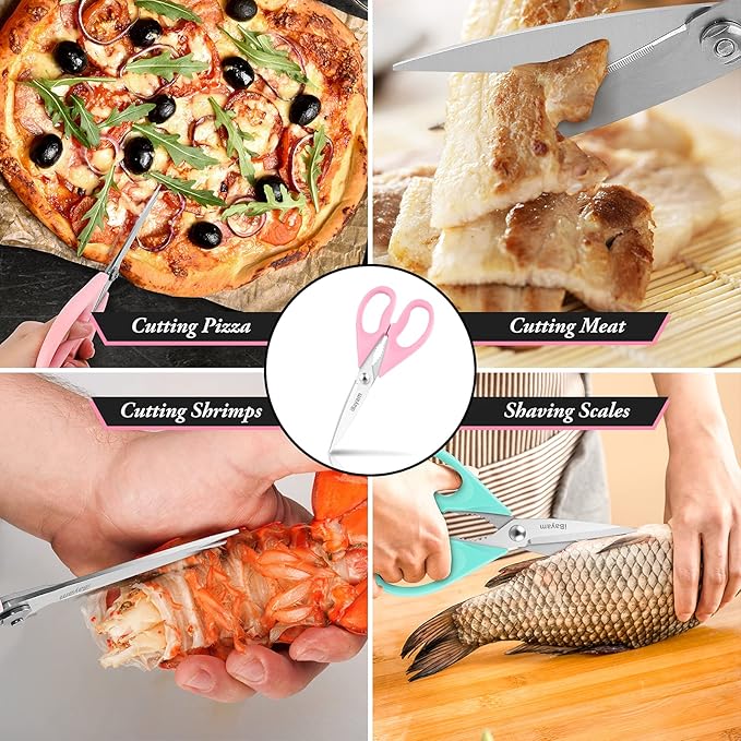 - STAINLESS STEEL SHARP BLADES: high quality hardened stainless steel blades easily cut through cardboard, twine, food, meat, vegetables, chicken, poultry, fish, herbs, seafood, BBQ, food packing bags and more. Great as Food Scissors, Meat Scissors, Cooking Scissors, Scissors Kitchen, Cooking Shears, Poultry Scissors, Utility Scissors, Meat Cutting Scissors.