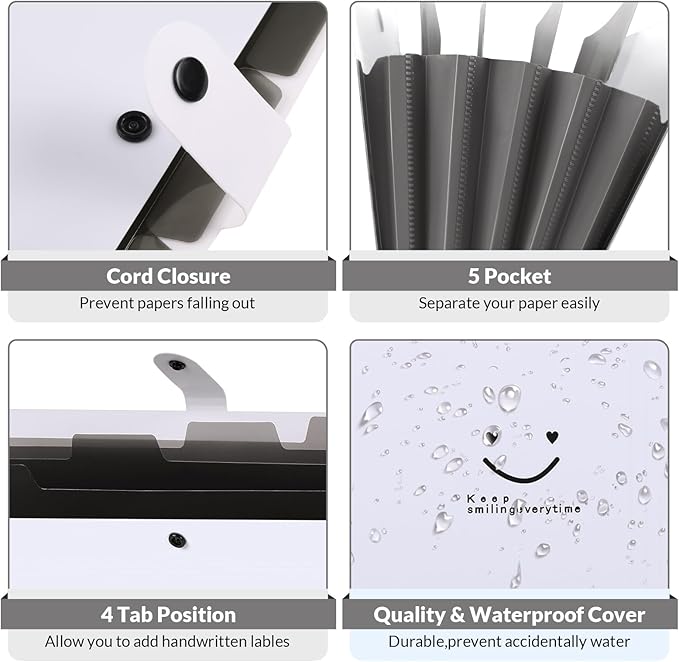 SKYDUE 5 Pocket Expanding File Folder, Letter Size Portable Accordion Folders for Documents for School Office, White