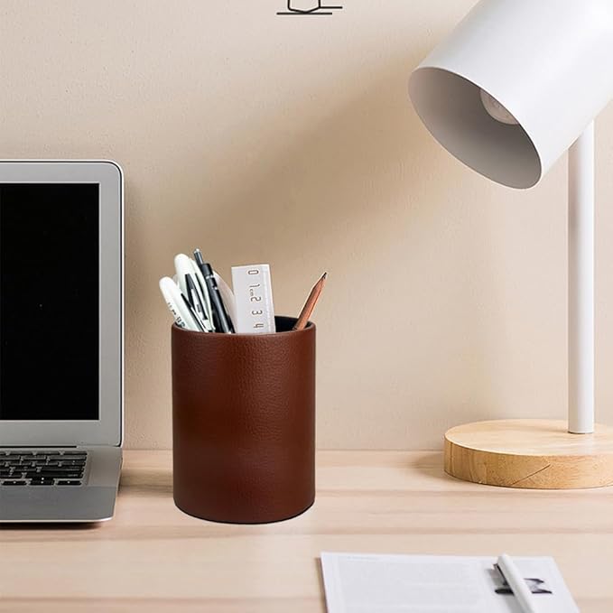 - HOME OFFICE ACCENT: The pen holder is covered in an elegant and stable leather with delicate stitching to keep your home decor looking stylish and chic while functioning as a home organizer.Simple design, geometric cylinder shape, light luxury retro style, full of quality, simple and practical storage bucket for desk, enjoying a relaxed quality life. It is the best companion for your desk.