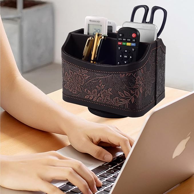 - EXQUISITE FASHION DESIGN: our remote control storage comes with an easy-to-spin 360° rotating base, providing you easy access to put or take items, whether you place it on the couch, armchair,table, or anywhere around your house , The 5 compartment desk organizer can be used to store remote controls, office supplies, media accessories, small electronic devices and more.