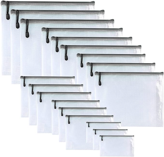 Oaimyy-18 Pcs,Plastic Mesh Zipper Pouch Document Folders Bag Zipper Zip File Folders for Office Supplies, Travel,Organizing Storage (6 Sizes, Black)