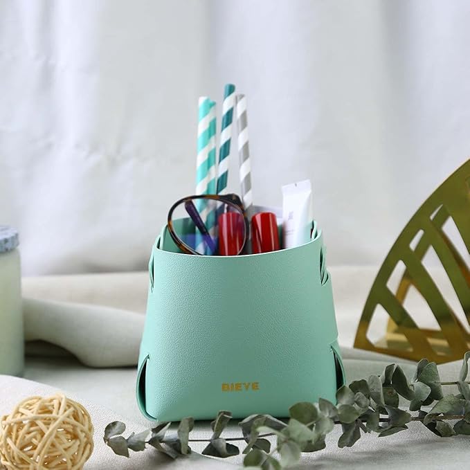 Bieye LSB008 Collapsible Leather Storage Bin Decorative Desk Organizer for Jewelry Makeup Pen Pencil Glasses Remote Controller Storage (Mint Green, 4" WX4 LX4 H)