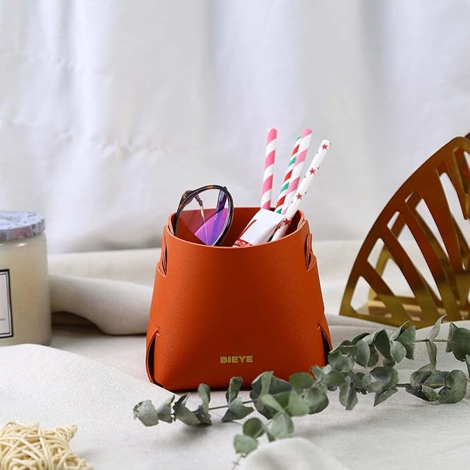 Bieye LSB005 Collapsible Leather Storage Bin Decorative Desk Organizer for Jewelry Makeup Pen Pencil Glasses Remote Controller Storage (Orange, 4" WX4 LX4 H)