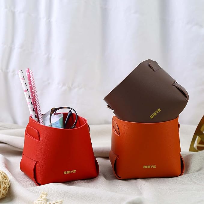 - SIZE: 4"Wx4"Lx4"H, open top, foldable, made of artificial leather with nappa texture, Multi-colors available. It perfectly fits your desk in the office and home.