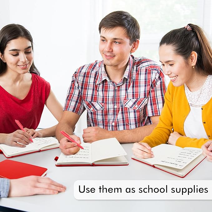 - Feela 12 Pack Classic Ruled Notebooks contains 12 classic red ruled sturdy cover notebooks and 12 Black Retractable Pens. Each of the notebooks measures 8.3” x 5.1”, which is perfect to carry and easily held by young girls and boys. These black cute pens are customized to be placed in the pen holder, which is pretty convenient.