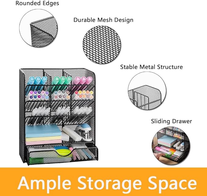 Spacrea Metal Pen Organizer, Pencil Holder for Desk, Desk Organizer with Drawer for School, Home, Art Supplies (Black)