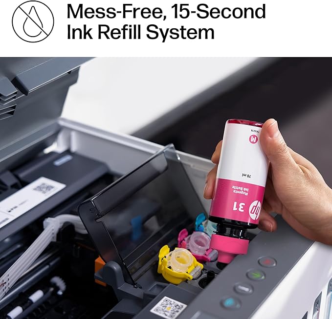 - MESS-FREE REFILL – Replenish ink with HP's easy-access, mess-free refill system. Simply plug the ink bottles into the ink tank and let them drain—no squeezing, no spilling