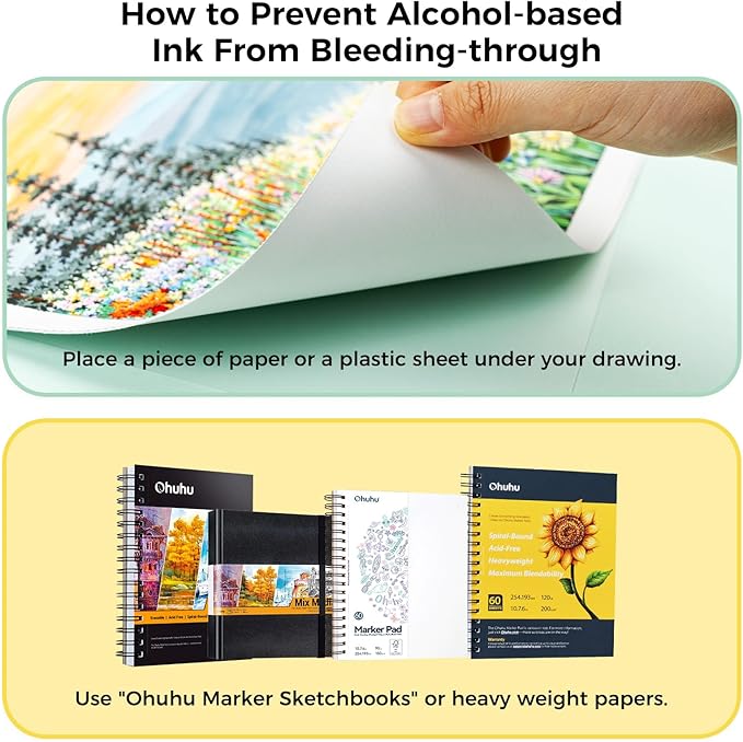 - EASY-BLENDING & FAST-DRYING: Forget about blotchy, uneven coloring. High-quality ink, which is non-toxic and quick drying, blends seamlessly to achieve beautiful coloring effects, making it perfect for beginners. To prevent alcohol-based ink from bleeding through, put a plastic sheet under the paper or use Ohuhu marker sketchbooks or heavy-weight papers. Plus, please cover promptly after use for longer use.
