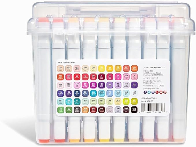 KINGART 424-60 PRO Double-Ended Alcohol Ink Art Markers, 60 COLORS, Fine Point & Chisel Tips, Permanent with Superior Blendability, Includes Plastic Case, 60 Pc.