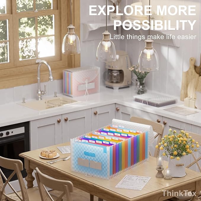 - MONTHLY BILLS ORGANIZER - ThinkTex 26 pockets accordion file organizer, top and bottom both expandable, A-Z multi-colored tabs, for letter/A4 size