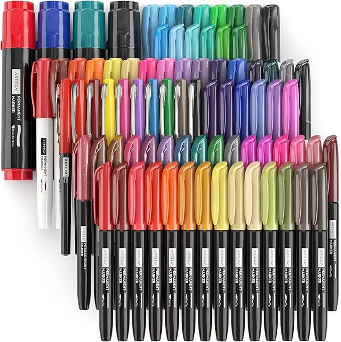 ARTEZA Permanent Markers – Set of 80 with 61 Assorted Colors, Low-Odor Quick-Dry Paint Pens, Broad, Fine, and Brush Tip for Arts, Crafts & Labeling