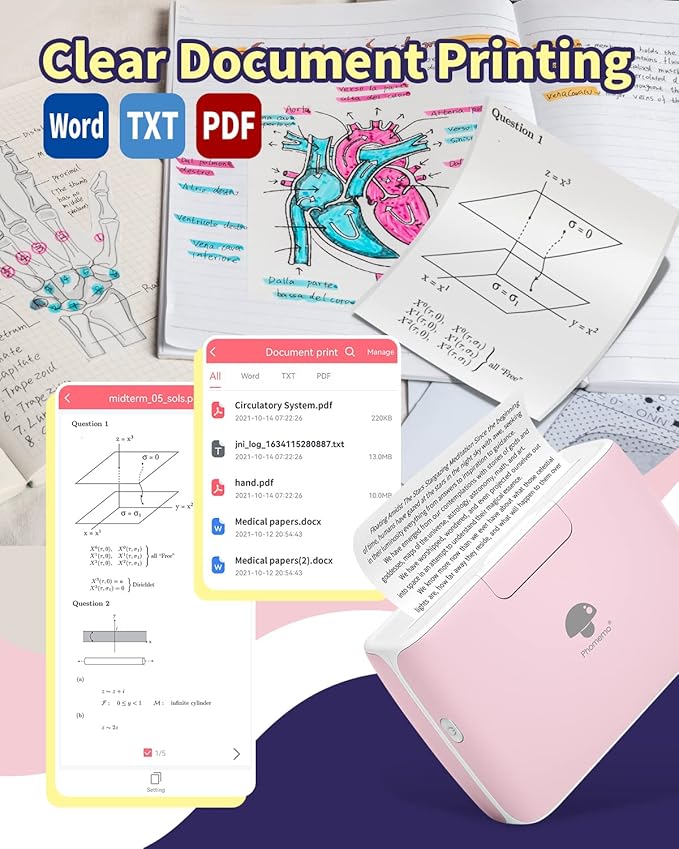 Phomemo 4" Portable Thermal Printer Printpods- Bluetooth Inkless Printer, Support 2/3/4 inch Printing Width, 300dpi, Compatible with Phones, Computer, Ideal for Documents, Notes, Label, Sticker