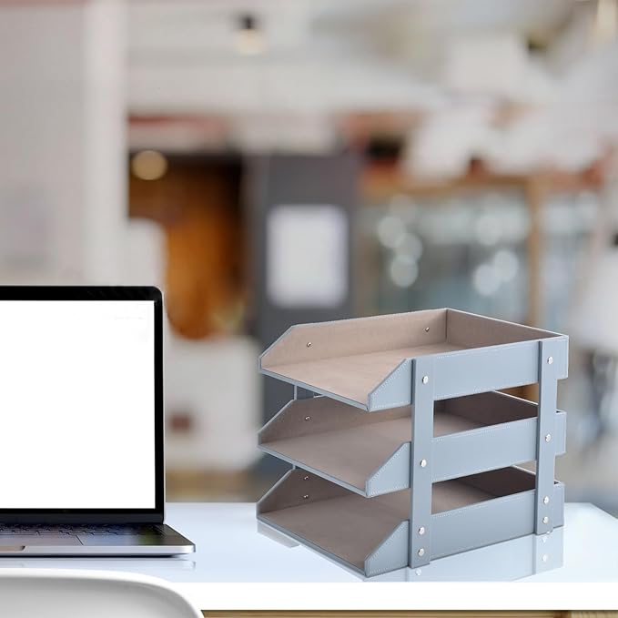 Leather Desk Organize Holder,3-Layer Stackable Letter Tray,Used to Store documents,Folders,Stationery,Magazines,Paper,and Other Home Office Supplies,Desk File Rack (Grey)