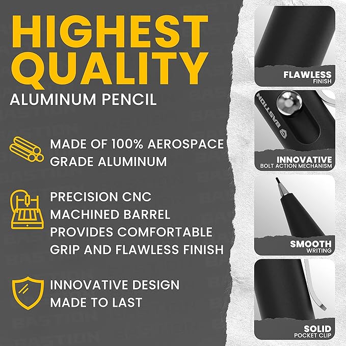 BASTION® Luxury Mechanical Pencil, Professional Lightweight Medium Point Aluminum Pencil for Birthday Gift includes 20 x 0.77mm Lead Refills - Black