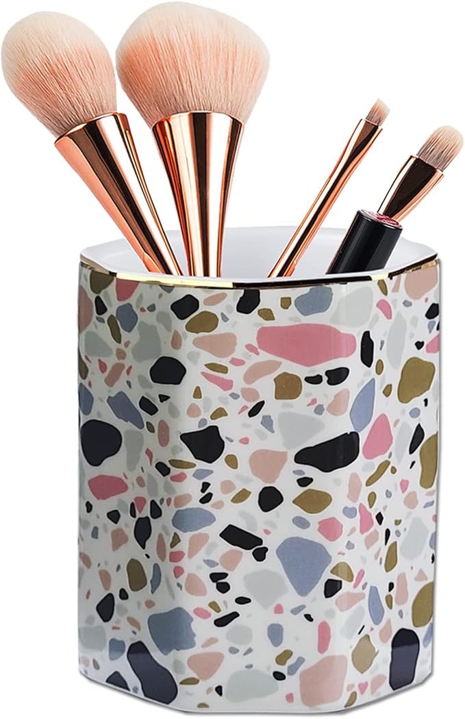 Pen Holder, Makeup Brush Holder Ceramic Shiny Gold Terrazzo Marble Stone Pattern Pencil Cup for Girls Kids Women Durable Stand Desk Organizer Storage Gift for Office, Classroom, Home Pink