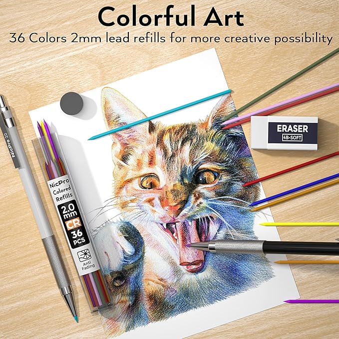 - 1.Awesome Artist Set:Nicpro drawing mechanical pencil set comes with 5pcs metal 2mm mechanical pencils in 5 colors ( White to Black ), 5 tube graphite lead refills (12pcs/tube, 120mm length ), 1 tube 36 color lead refills, 2pcs sharpener, 1pc 4B soft erasers,1pc kneaded eraser and 1pc file board and a leather mechanical pencil case.