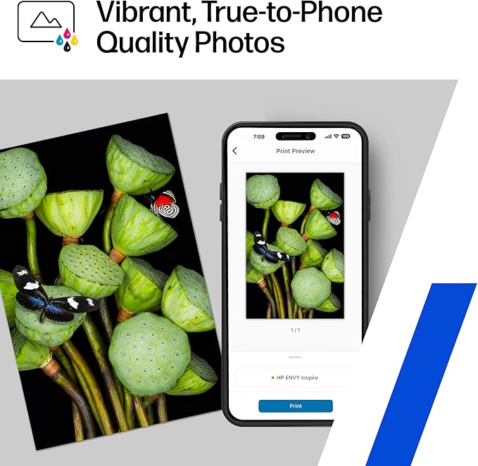 - VIBRANT PHOTOS – Photos that look as vibrant as they do on your screen with true-to-phone quality prints, plus custom photo features in the HP app. HP 5x5" square and 4x12" panoramic photo paper sizes are optimized for the HP Envy Inspire series