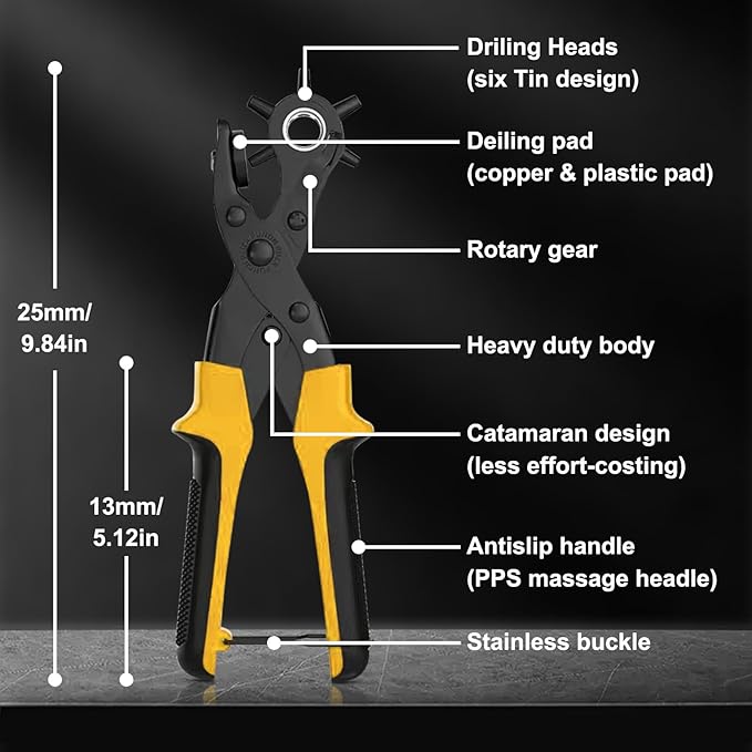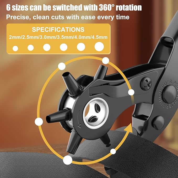 - 【Multi-function】The punch plier has 6 different sized holes: 2mm, 2.5mm, 3mm, 3.5mm, 4mm and 4.5mm and is commonly used for punching round holes in leather, belts, plastic, rubber, canvas, fabric, cardboard, saddles, and similar materials; especially useful as a leather hole punch