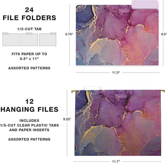 - HOME, OFFICE, OR BOTH - This deluxe designer printed hanging file folder kit will look fantastic in any home, office, or classroom. Keep better track of your documents with color coordinated files and folders!