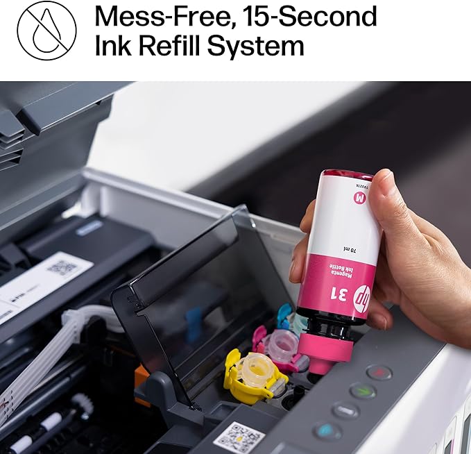 - MESS-FREE REFILL – Replenish ink with HP's easy-access, mess-free refill system. Simply plug the ink bottles into the ink tank and let them drain—no squeezing, no spilling