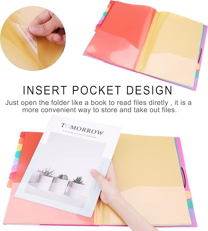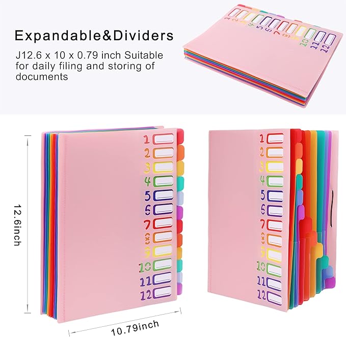Rainbow Tab Expanding File Folder - 24 Pockets, Durable A4 Letter Size Organizer, Water-Resistant Plastic Dividers, Home/Office/School Document Holder (Pink)