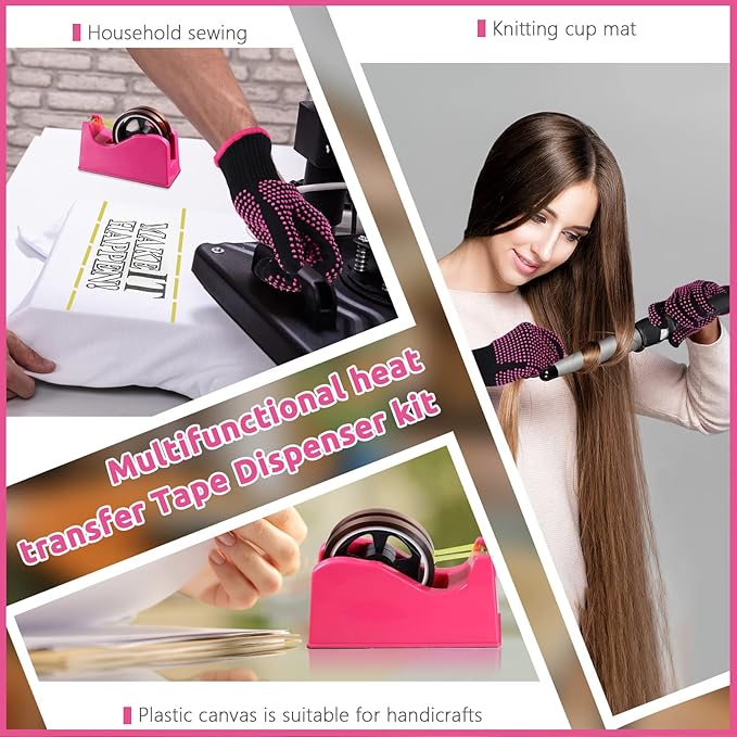 Sabary 9 Pcs Heat Tape Dispenser Set, Sublimation Tapes Dispenser Adhesive Roll Holder 2 Pcs Heat Resistant Gloves with Silicone Bumps 6 Pcs Thermal Tape for Office Home (Rosy)