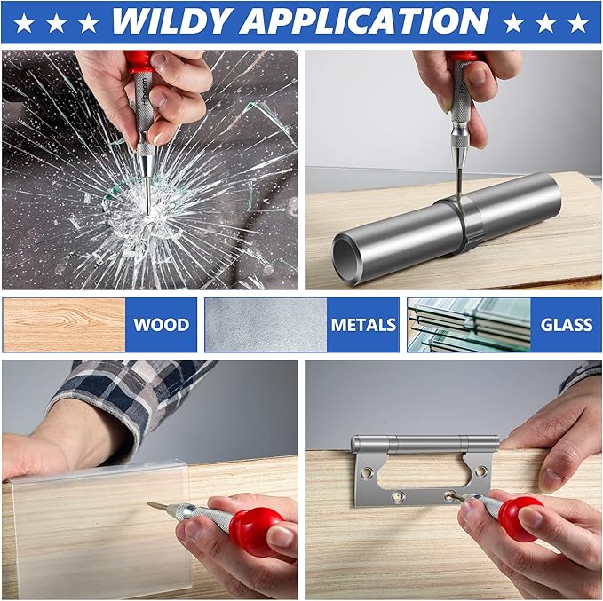 - Practical Center Punch Tool: the automatic center punch is made of chrome plated steel body, have high impact resistance and wear resistance; The red cap on the top can give you a good grip while you apply pressure, unscrewing it can adjust the force of impact; A deep knurled finger grip for easy handling and better control with one hand; Makes center punching a breeze.