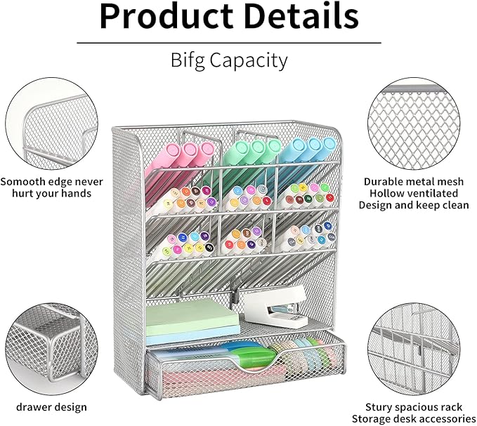 - 【Stylish Modern Design】Silver curved lines with a mesh design give this marker organizer a unique artistic aesthetic that perfectly dresses up your desktop. Perfect for office, school, art room, etc. It is practical and beautiful, it is one of the perfect gifts for relatives and friends.