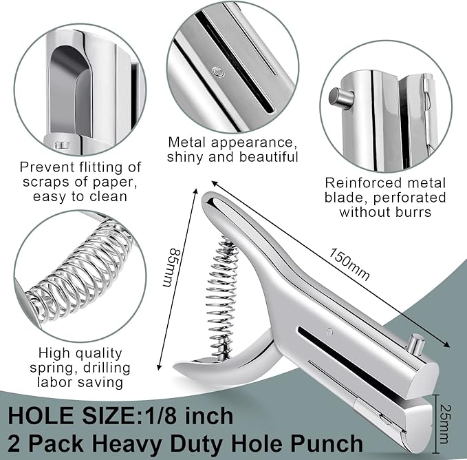 Heavy Duty Hole Punch Single One Hole Puncher Paper Hole Punch Long Reach Reduced Effort 2 Inch Deep Throat Hand Alloy Punch for ID PVC Cards 5 Inch Tall 25 Sheet Capacity(2 Pcs,1/8 Inch Hole)