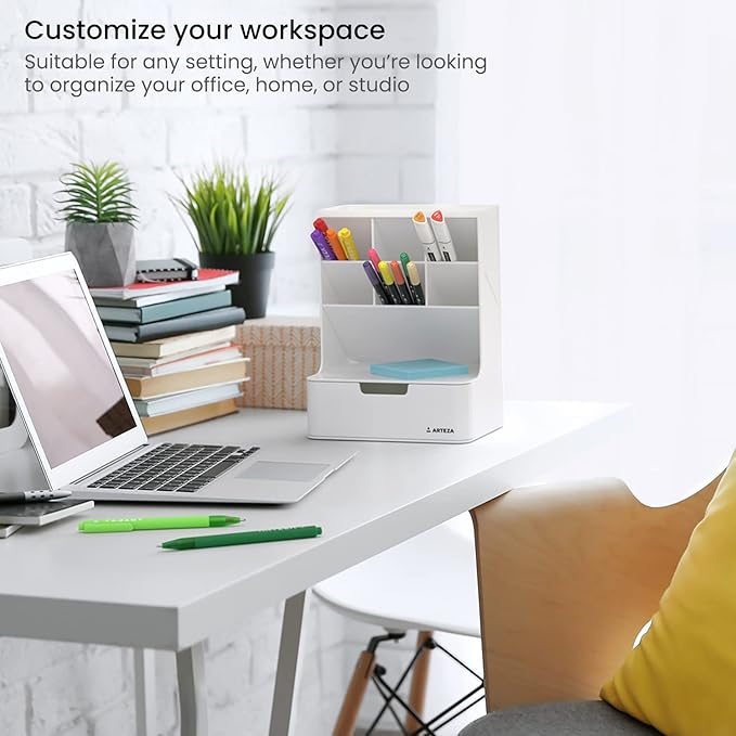 ARTEZA Desktop Pen and Marker Organizer, 6-Compartment White Pen Holder for Desk with Stationery Drawer, Makeup Organizer